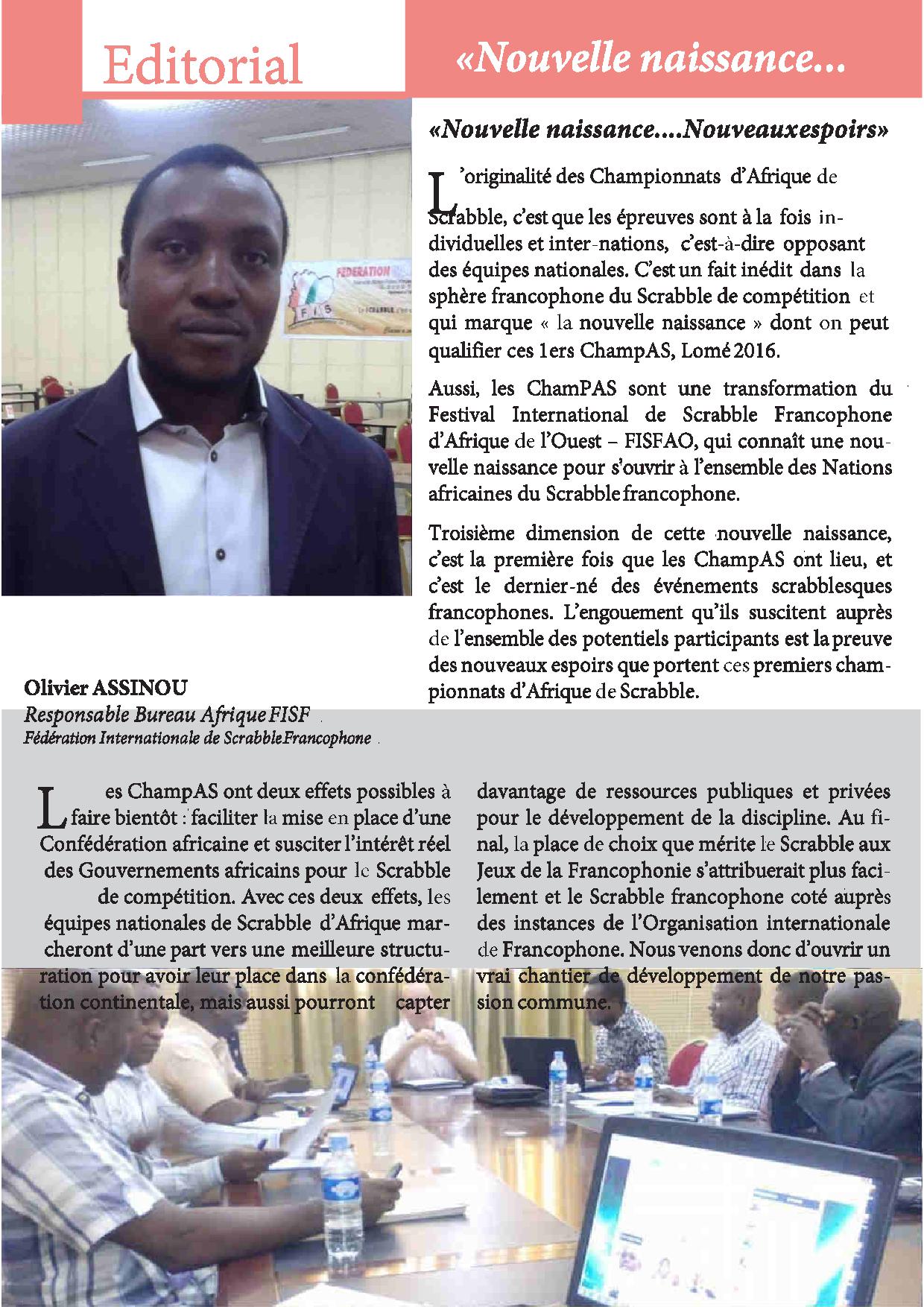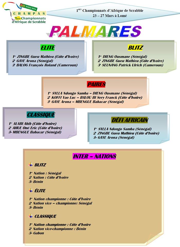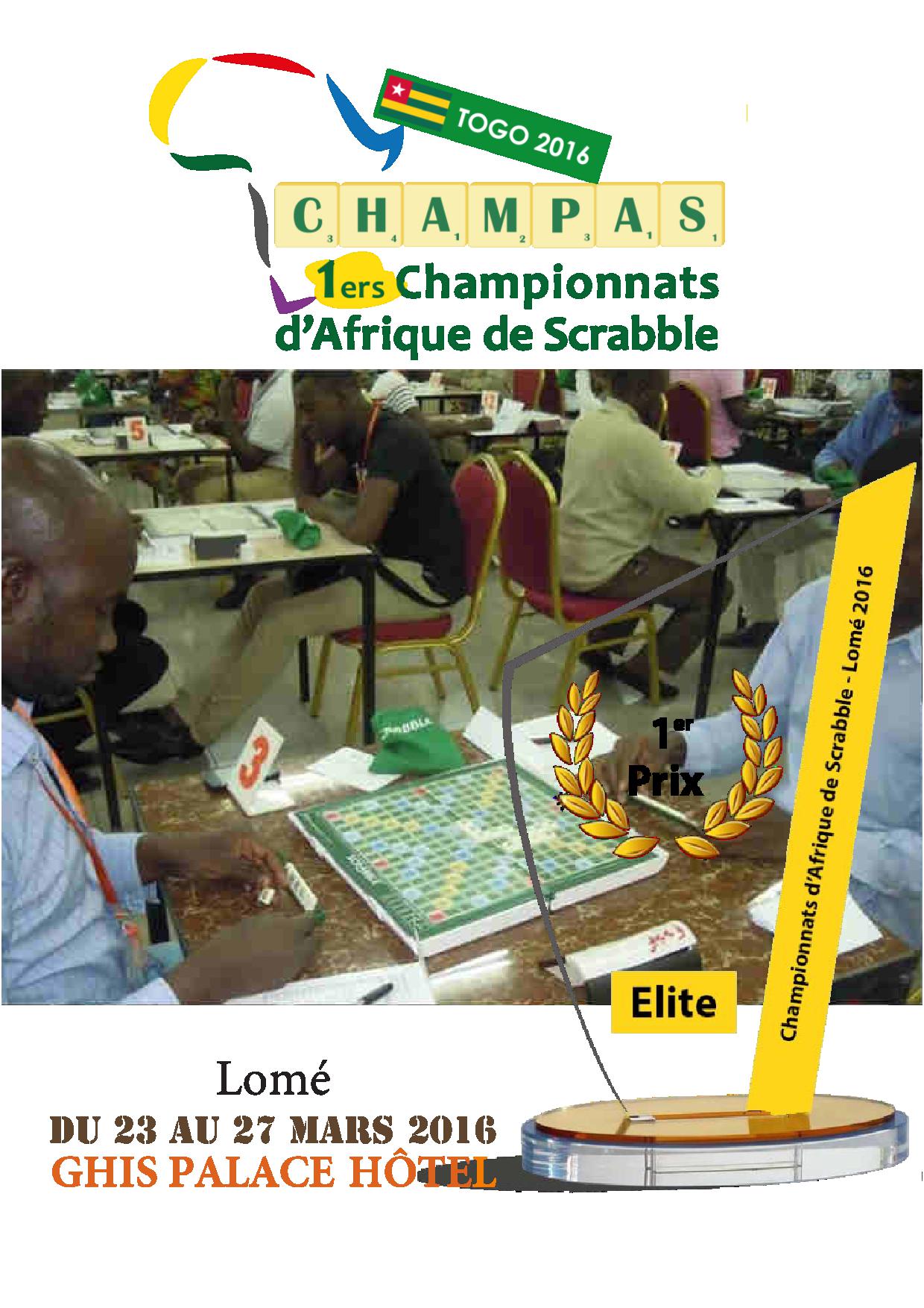 Du 23 au 27 mars 2016 auront lieu les 1ers Championnats d'Afrique de Scrabble (ChampAS) au Ghis Palace Hôtel de Lomé (Togo).