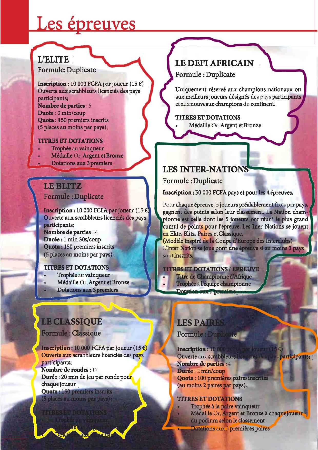 Soutenus par la Fédération internationale de Scrabble francophone (FISF), ces grands championnats verront une vingtaine d'équipes nationales de Scrabble francophone d'Afrique se rencontrer pour disputer 5 épreuves individuelles et 4 épreuves par équipes :