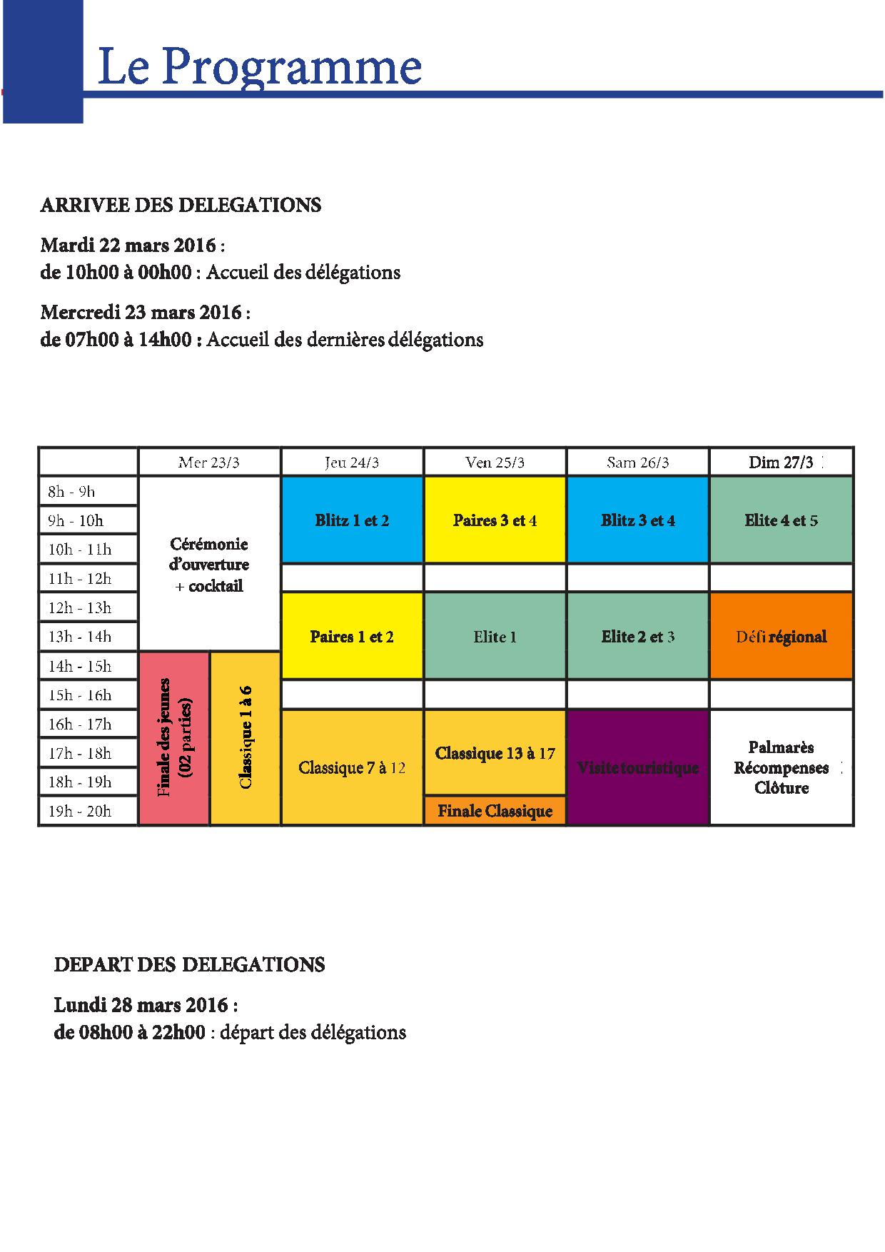 - Classique (17 rondes + finale) : du 23 au 25 mars.